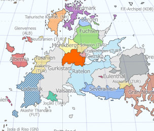 Wobei die Karte so ganz ohne Hinweis natürlich eher problematisch ist, weil man als Unwissender mühsam suchen muß, wo Gurkistan liegen soll. Es liegt jedenfalls zwischen Ratelon und Monikberg und ist orange eingefärbt.